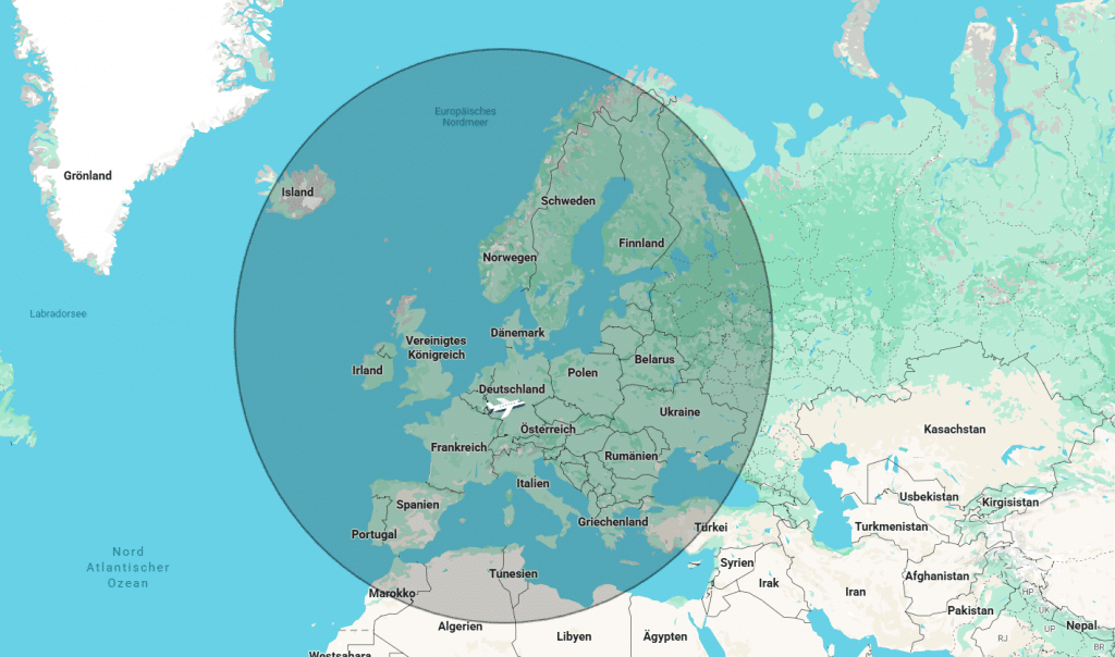Die Privatjets Cessna Citation Mustang und Embraer Phenom 100 verfügen über vergleichbare Reichweiten von rund 2.200 bis 2.400 km. Der dargestellte Flugradius gilt für beide Flugzeuge und deckt einen großen Teil Europas ab. Dadurch sind zahlreiche innereuropäische Ziele nonstop erreichbar.