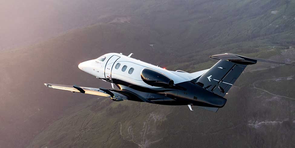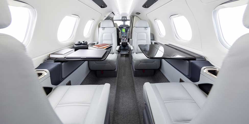 Die Embraer Phenom 100 verfügt über vier Passagiersitze in Clubanordnung. Dieser sogenannte Very Light Jet ist ein beliebter Privatjet für kürzere innereuropäische Flüge. Die Fluggäste schätzen vor allem die für die Flugzeugklasse vergleichsweise große Gepäckkapazität sowie die komfortable Kabine mit großen Fenstern und Stufenbeleuchtung.